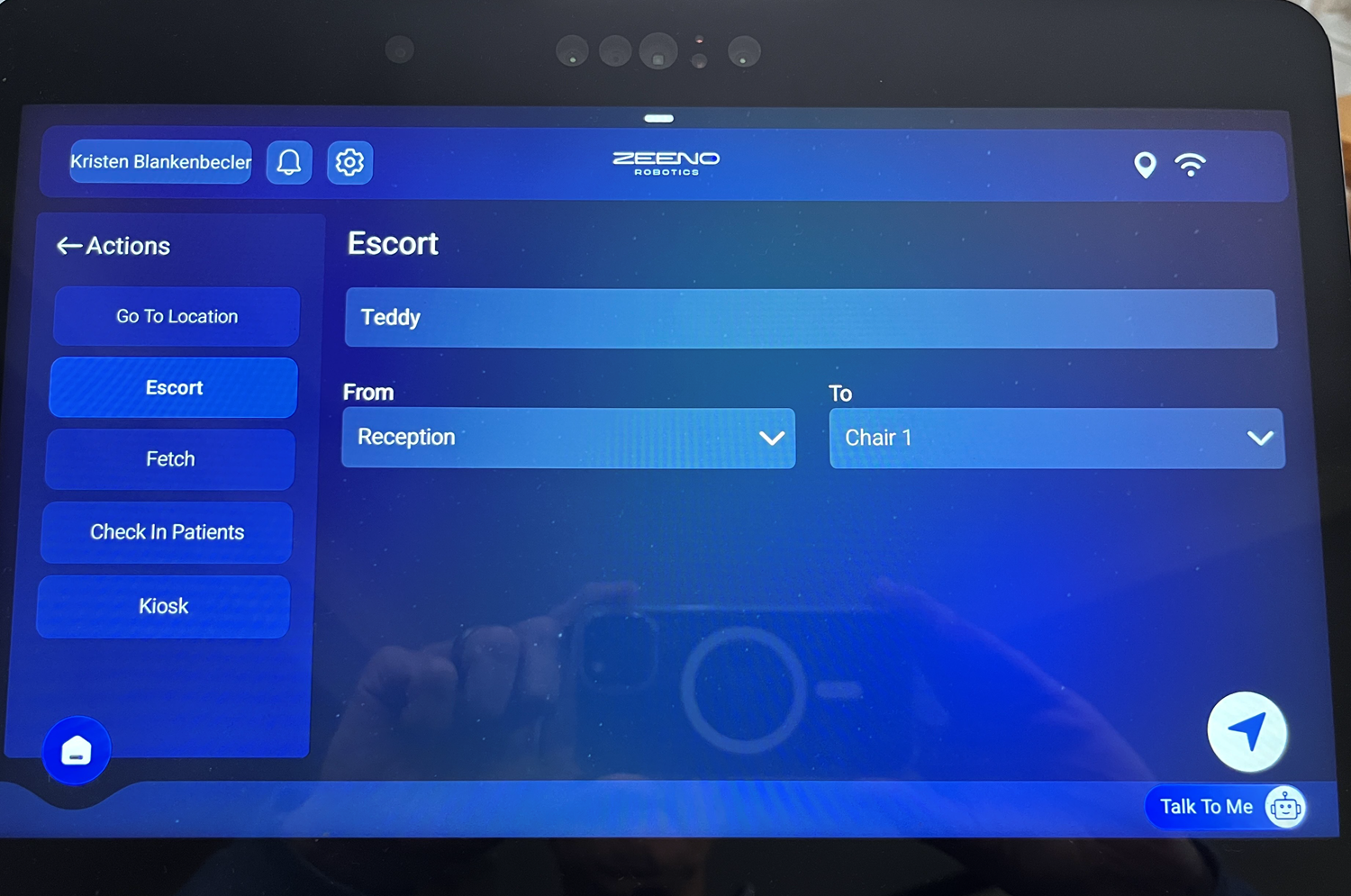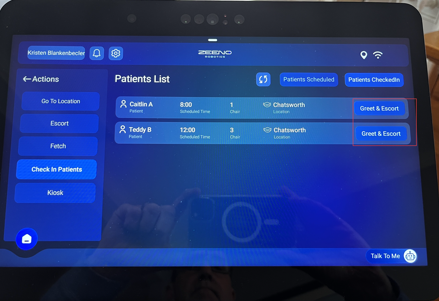 Greeting & Escorting Patients: From the "Patients Checked In" list, click Greet & Escort to send Zeeno to greet and escort a patient. This loads the escort screen with the patient's name pre-filled and the "From" location set to your Kiosk Mode location. Select the desired "To" location from the drop-down menu.