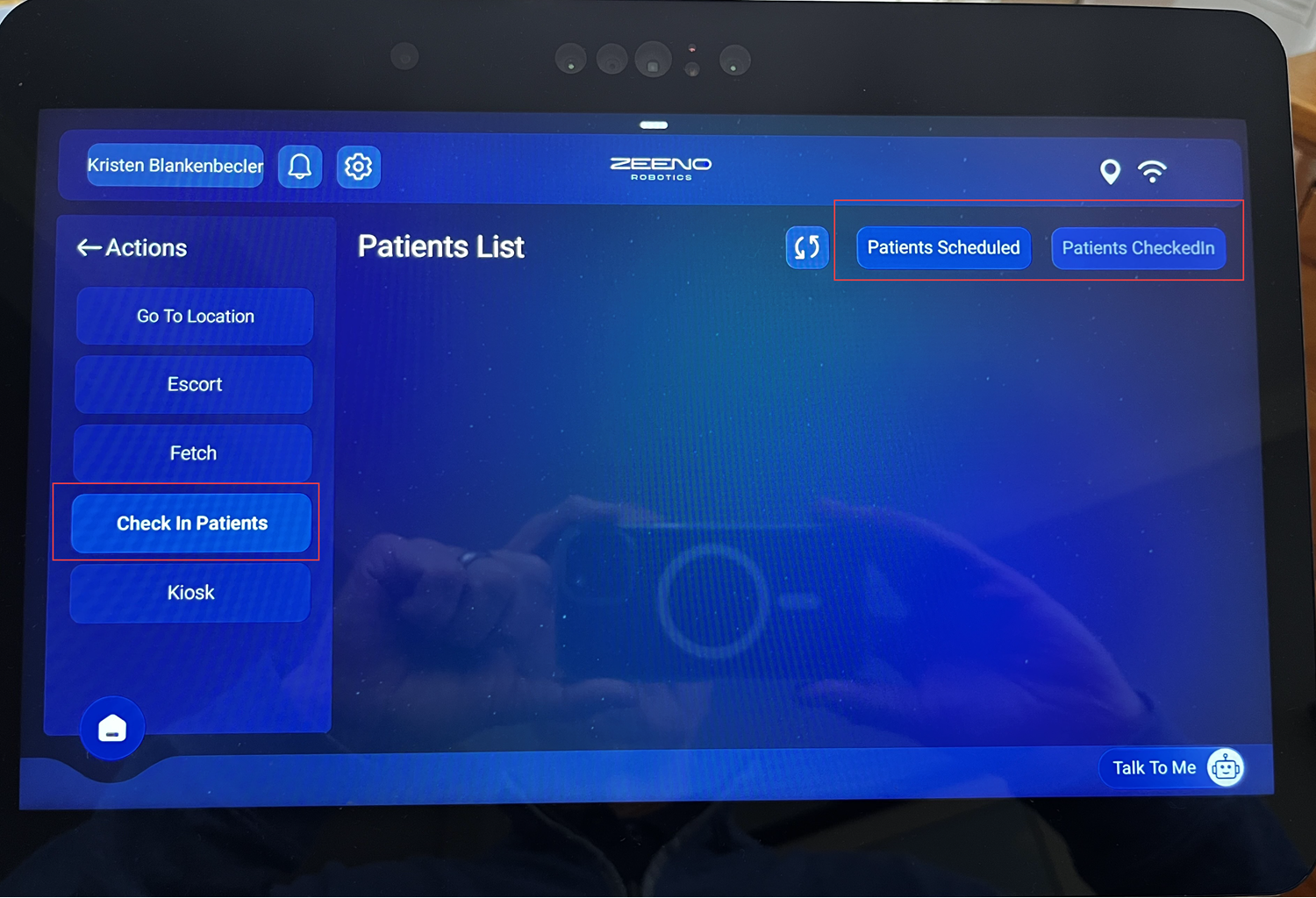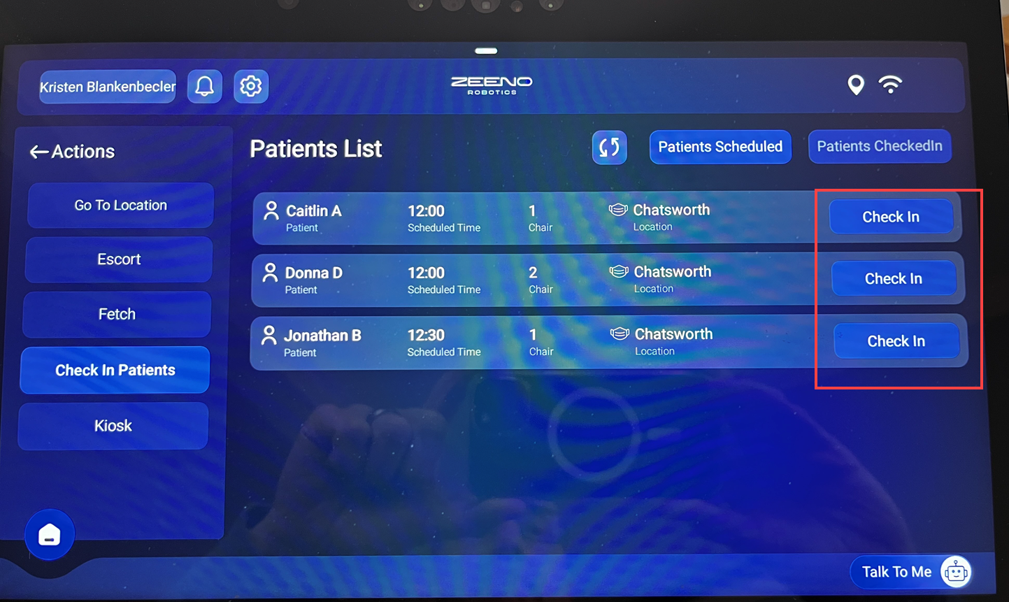Checking In Patients: Click Check In for a patient to update their appointment status in Dolphin to "Checked In." They will then appear on the "Patients Checked In" list on the robot.