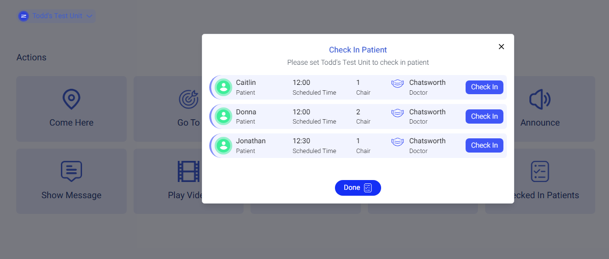 - Check In Patient: Displays all scheduled patients for the current day and selected locations.