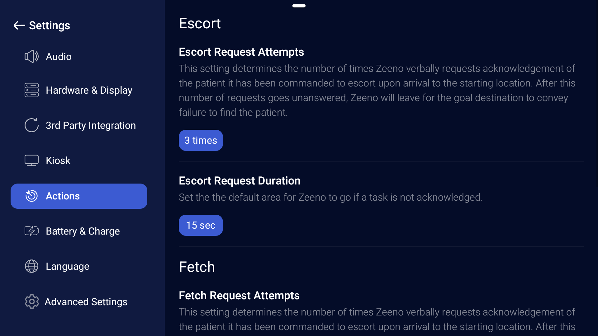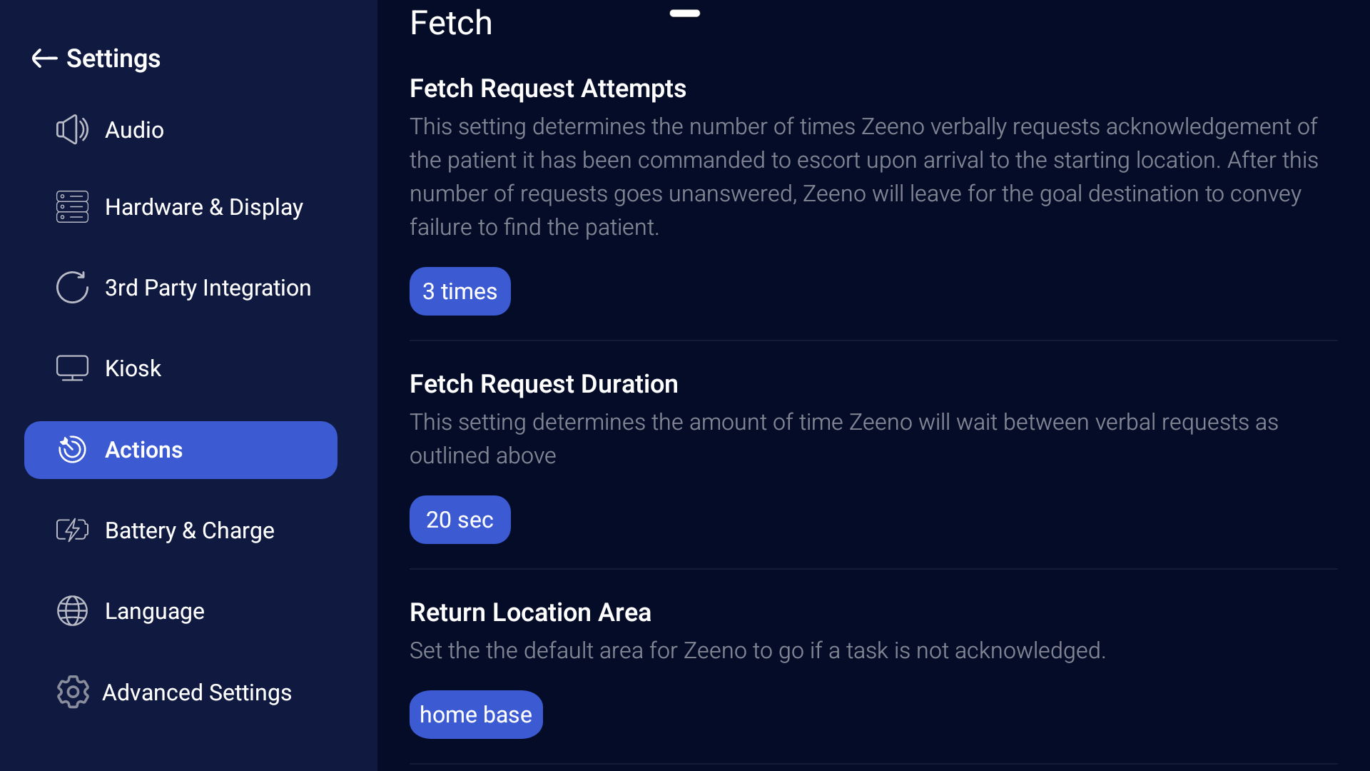 Fetch Request Duration | The amount of time, in seconds, Zeeno will wait between verbal requests. |
