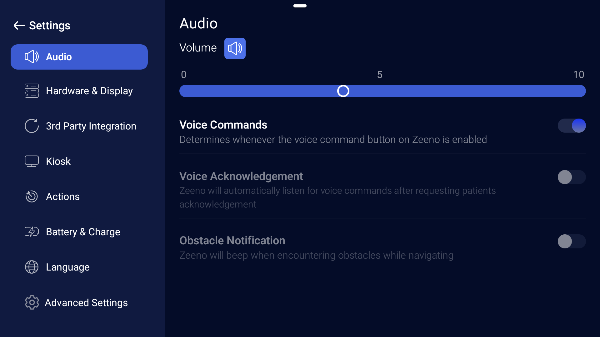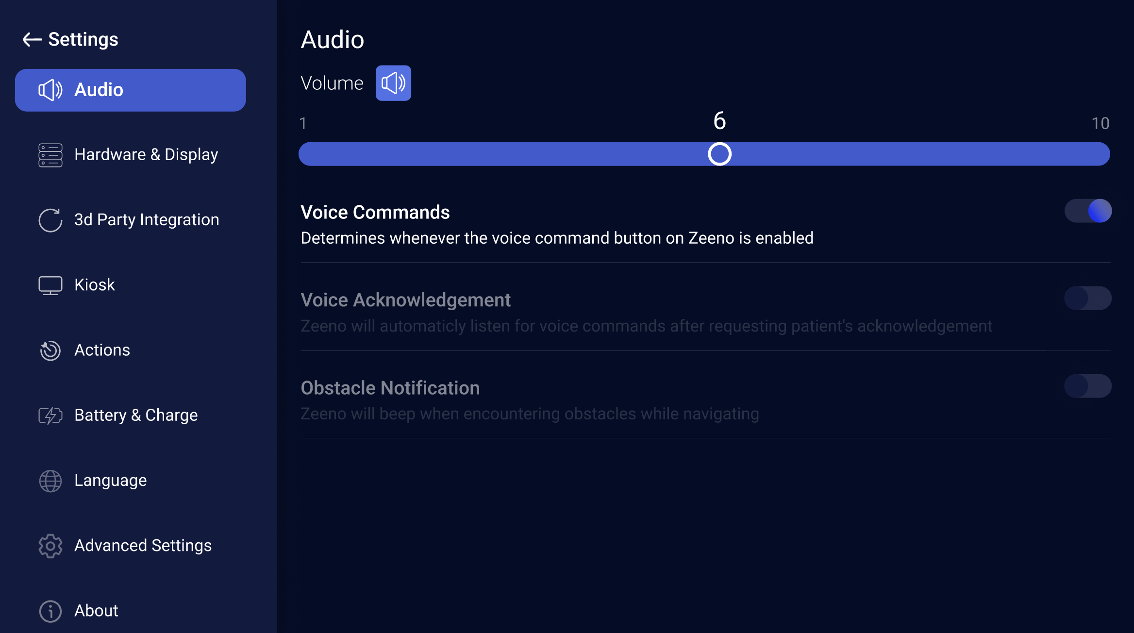 Voice Commands | You have the option to tell Zeeno to stop listening for commands or you can turn this on to have it listen for commands. |