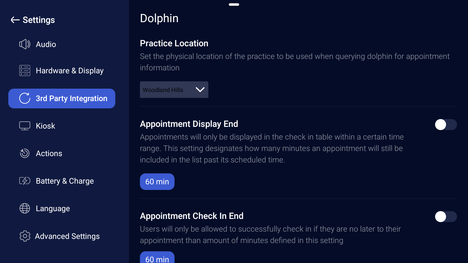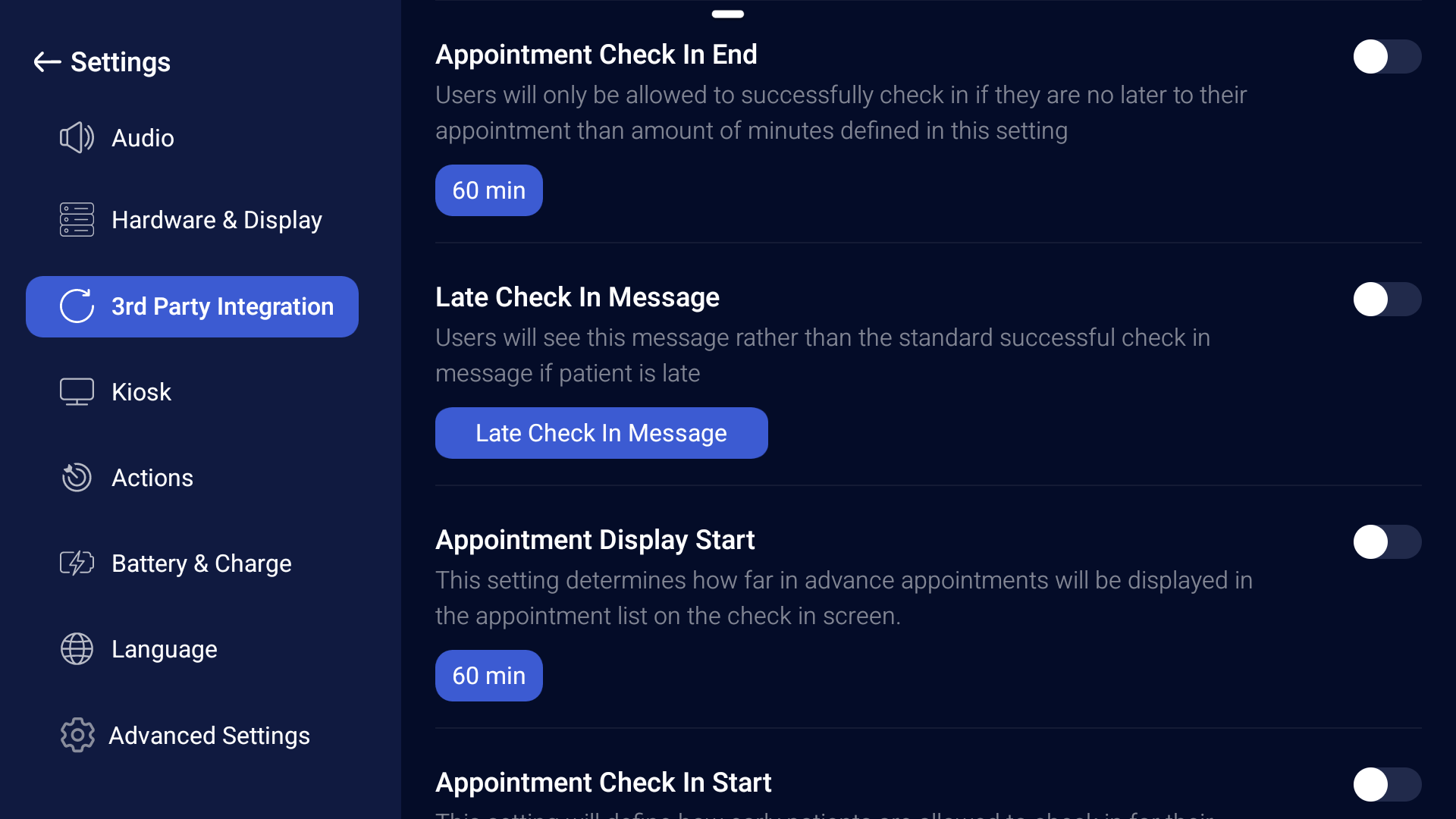 Appointment Display End | Set the range of time, in minutes, for appointments to display. For example, if set to 60 minutes, appointments scheduled within 60 minutes of "now" will dispaly |
