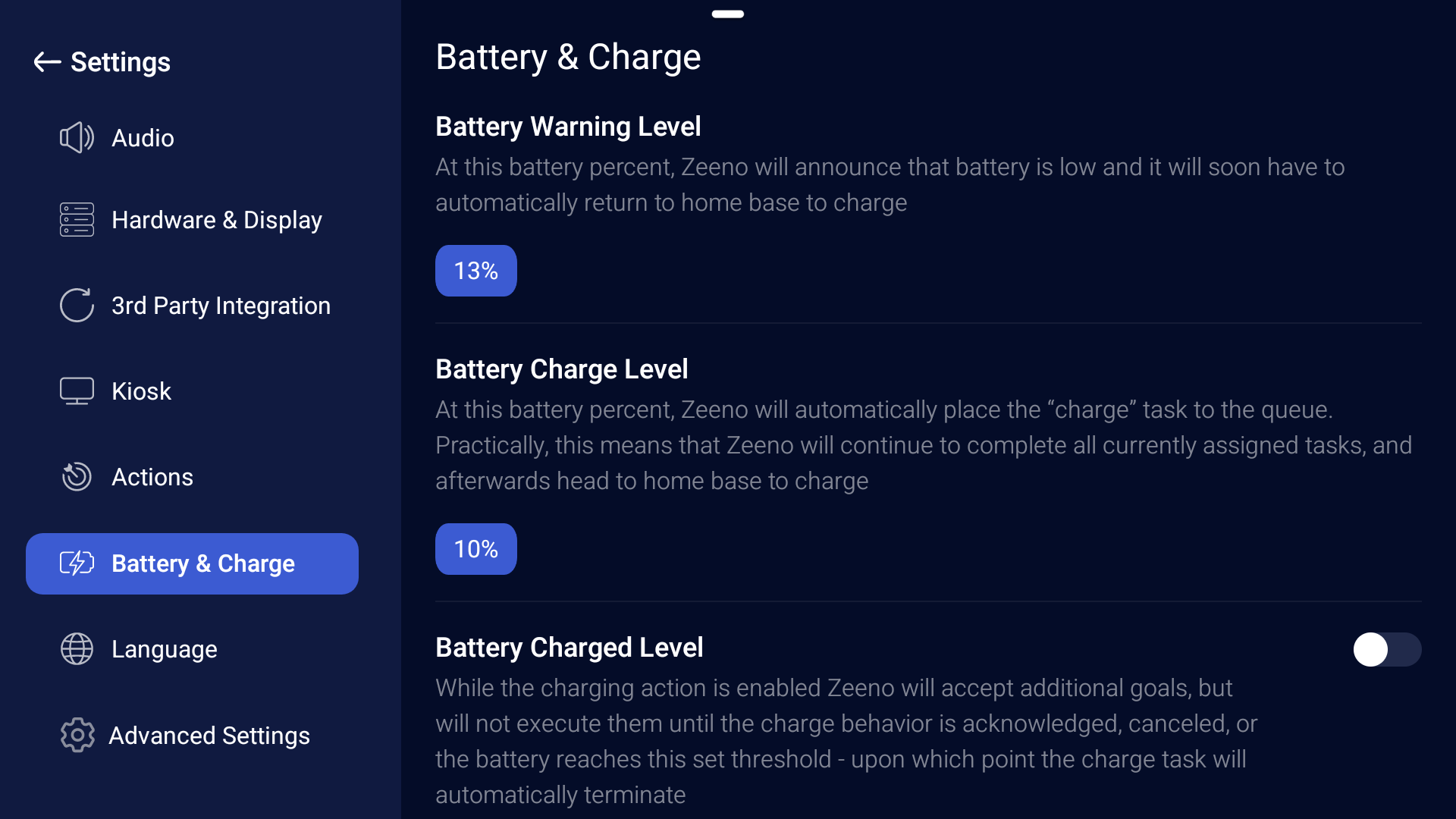 Battery Charged Level | You can set when you want Zeeno to consider itself charged enough to complete the remaining tasks or for the rest of the day. |