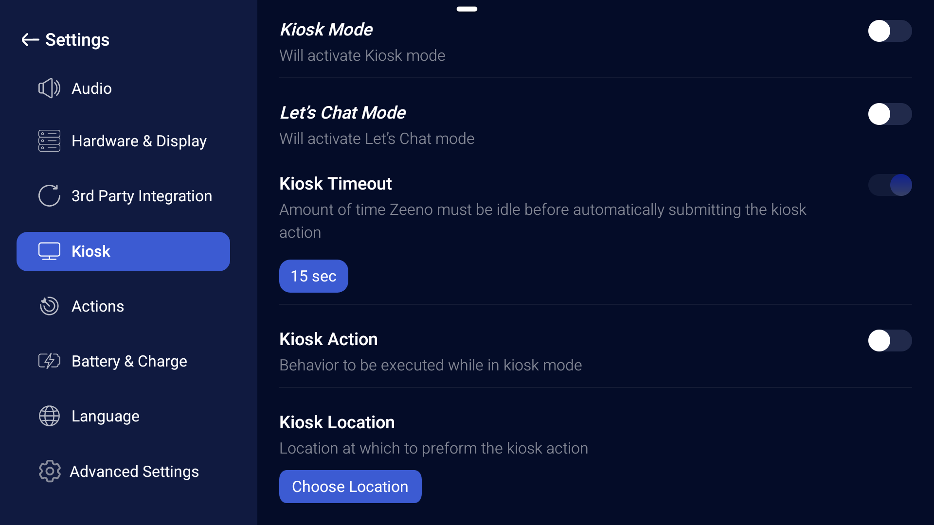 Kiosk Timeout | After this amount of time of not receiving a task, Zeeno will return to it’s set home location and return to kiosk screen. |