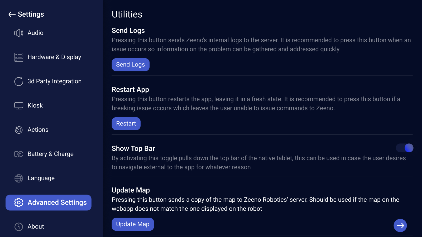 Restart App | This button restarts the Zeeno Robotics app entirely. |
