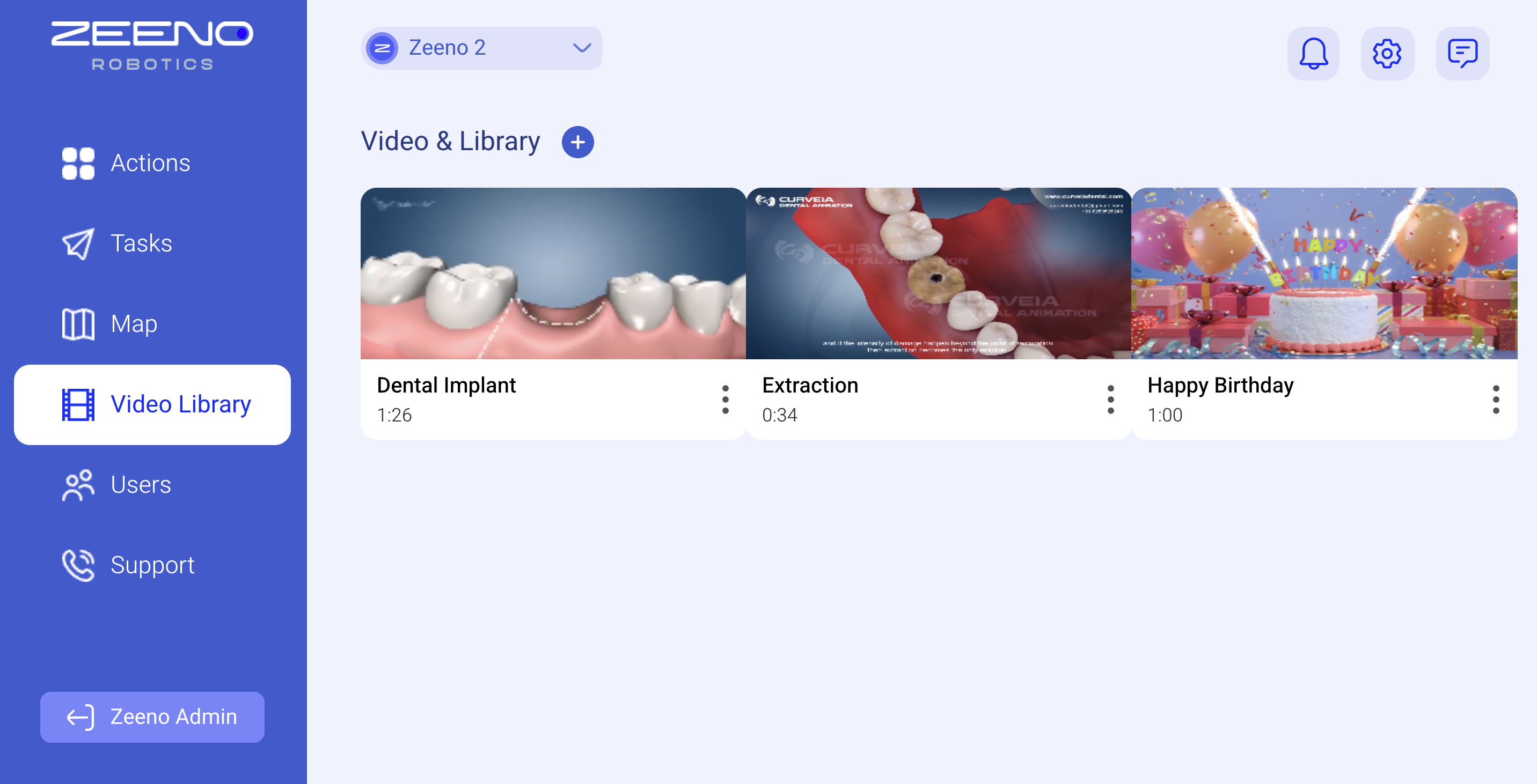 On this screen, you'll be able to see all of the videos that you upload once they're succesfully uploaded. You'll be able to edit the video library to reflect what you'd like it to on the robot. Need to delete a video or rename one? Here's the place for that. You can also click a few different videos so that they'll play back to back kind of like a playlist on your Zeeno.